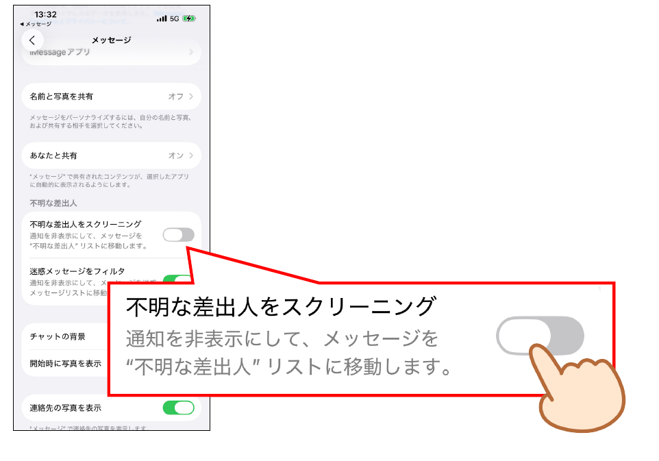 ◎ ① 連絡先に登録していない相手は「不明な差出人」へ自動振り分け